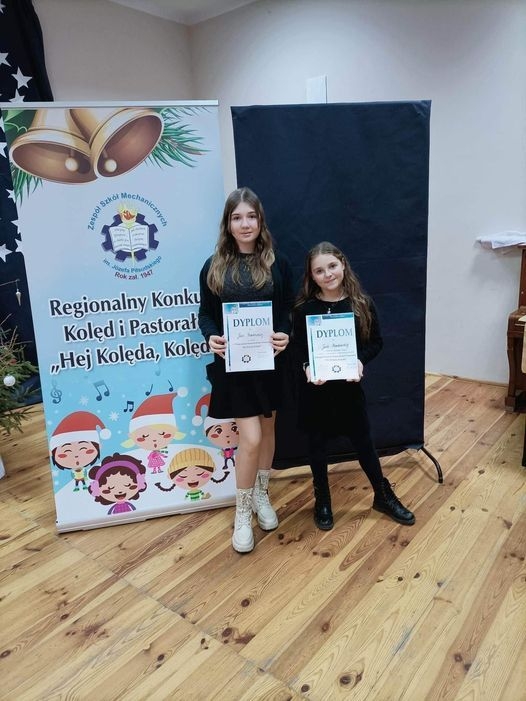 W czwartek 26 stycznia w Zespole Szkół Mechanicznych w Radziejowie odbył się Regionalny Konkurs Kolęd i Pastorałek. Naszą szkołę reprezentowały dwie uczennice - Lena Kryszak z kl. VI oraz Julia Borkowska z kl. III, które pięknie zaprezentowały się przed jury i publicznością. Warto nadmienić, iż Julka zajęła III miejsce w kategorii klas I - IV. Serdeczne gratulujemy!