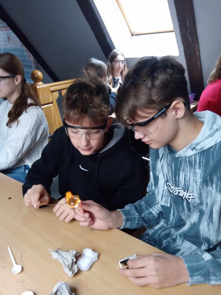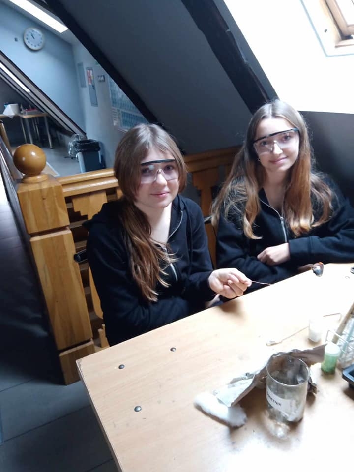 W dniu 13 listopada uczniowie z klasy siódmej i ósmej uczestniczyli w warsztatach chemicznych w Centrum Chemii w Małej Skali w Toruniu. Przeprowadzając różne doświadczenia zgłębiali swoją wiedzę a także kształcili umiejętności tj. posługiwanie się sprzętem i szkłem laboratoryjnym, dokonywania obserwacji i wyciągania wniosków oraz współdziałania w grupie.