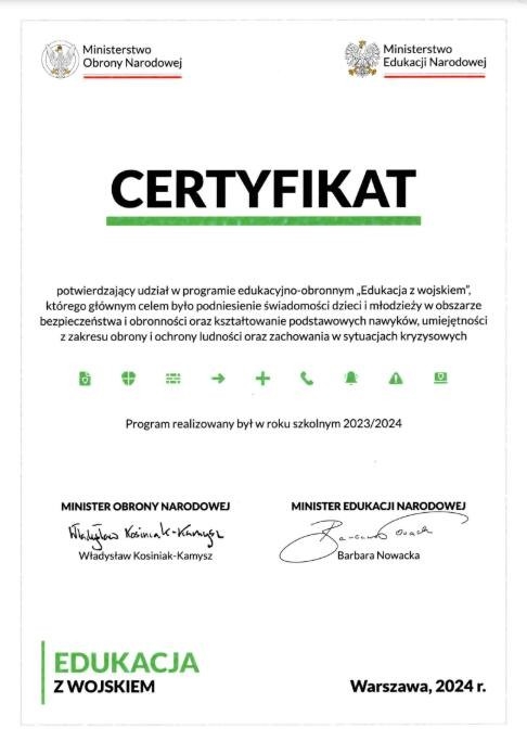 6 czerwca uczniowie klas starszych wzięli udział w programie edukacyjno-obronnym "Edukacja z wojskiem", którego głównym celem było podniesienie świadomości w obszarze bezpieczeństwa i obronności oraz kształtowanie podstawowych nawyków, umiejętności z zakresu obrony i ochrony ludności oraz zachowania w sytuacjach kryzysowych. Zajęcia objęte są patronatem Ministerstwo Obrony Narodowej i Ministerstwo Edukacji Narodowej
