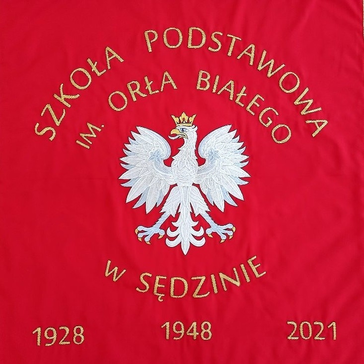 Płat tkaniny w kształcie kwadratu o wymiarach 100 cm x 100 cm jest czerwony. Czerwień, oznacza krew, którą niejednokrotnie nasz naród przelewał w obronie ojczystej ziemi Na tym tle, umieszczone jest godło państwowe. Godłem jest biały orzeł z głową ozdobioną złotą koroną, zwróconą w prawo. Przypomina on wszystkim Polakom, skąd pochodzimy, gdzie tkwią nasze korzenie. Dziób i szpony mają złotą barwę. Rozpostarte skrzydła orła symbolizują dążenia do najwyższego lotu, do pokonywania przeszkód i trudności. Są to cele, do których, pod kierunkiem nauczycieli, zmierzają nasi uczniowie. Wokół godła państwowego widnieje napis: Szkoła Podstawowa imienia Orła Białego w Sędzinie 1928 1948 2021.