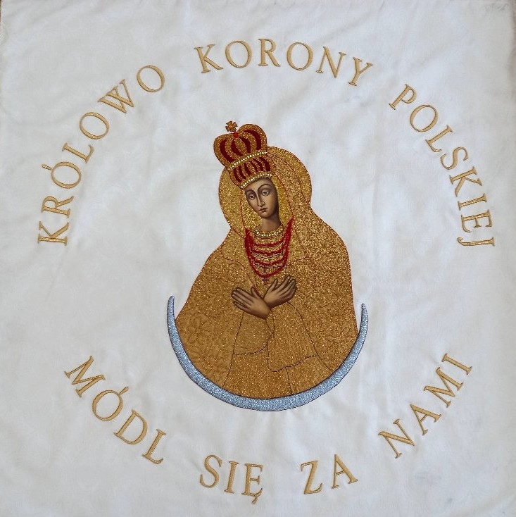 Płat tkaniny w kształcie kwadratu o wymiarach 100 cm x 100 cm w kolorze kremowym. Centralne miejsce zajmuje wyszyty wizerunek Matki Boskiej Ostrobramskiej z napisem „Królowo Korony Polskiej módl się za nami”.